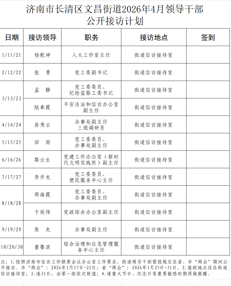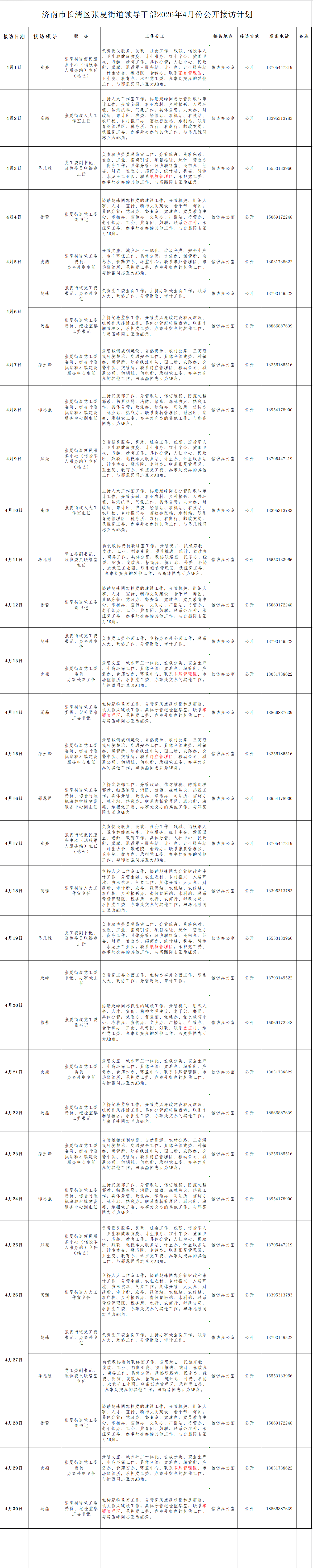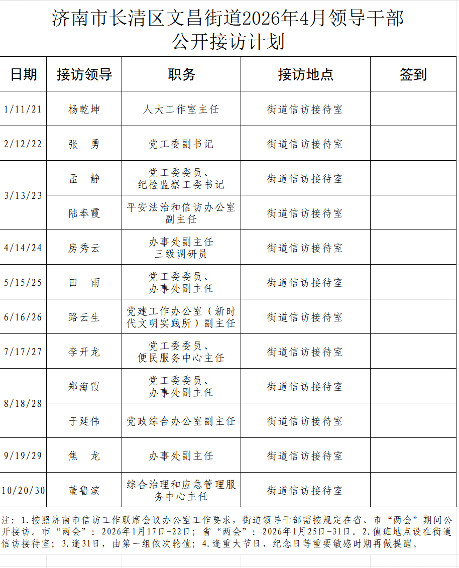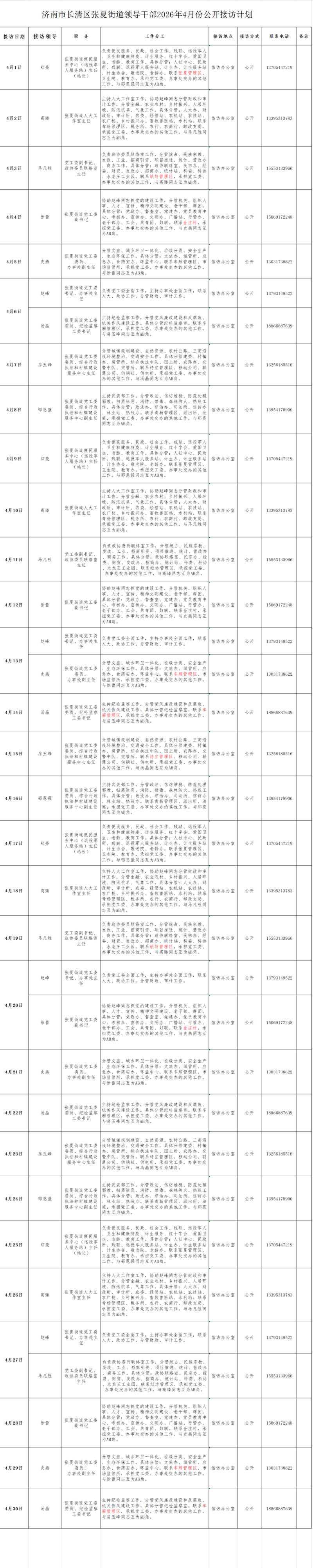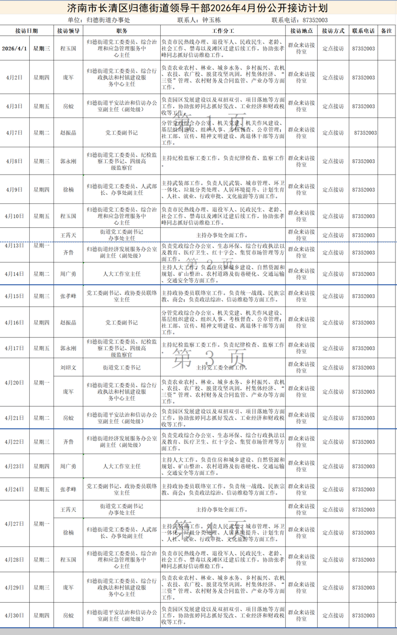 2026年4月街道(镇)领导干部接访日程安排表