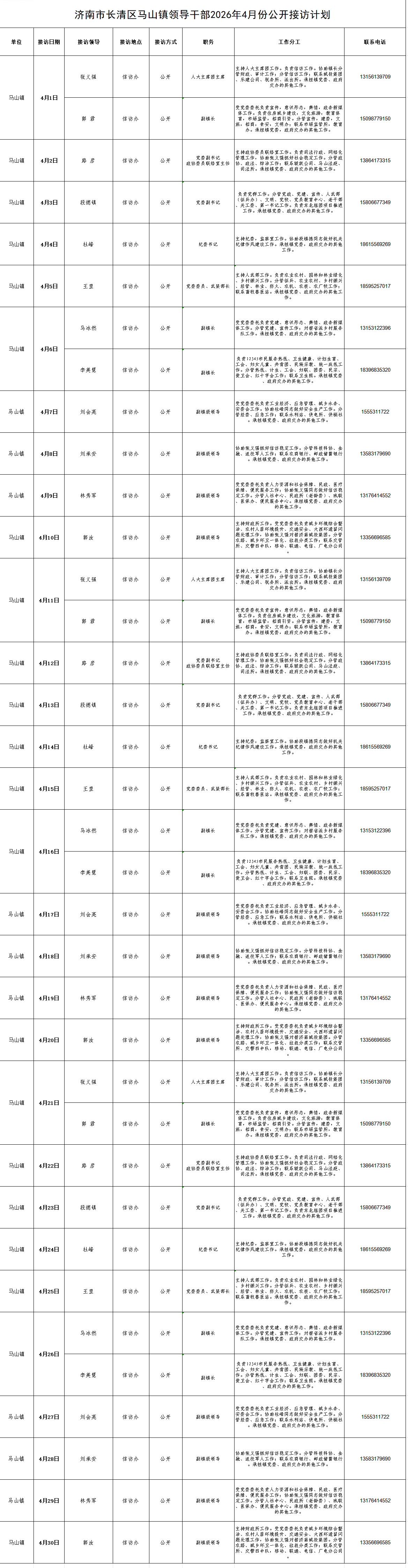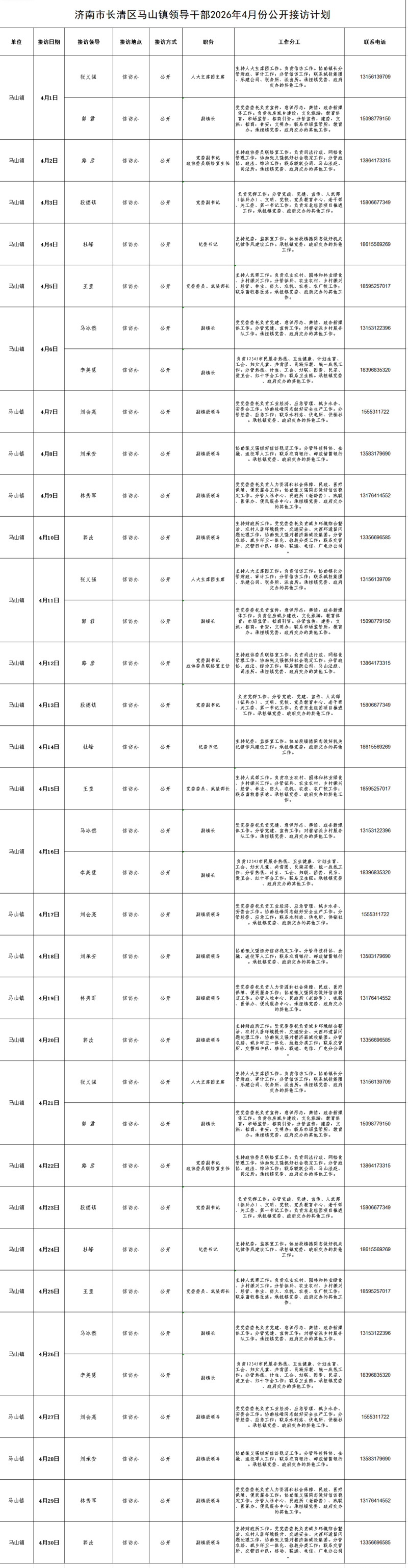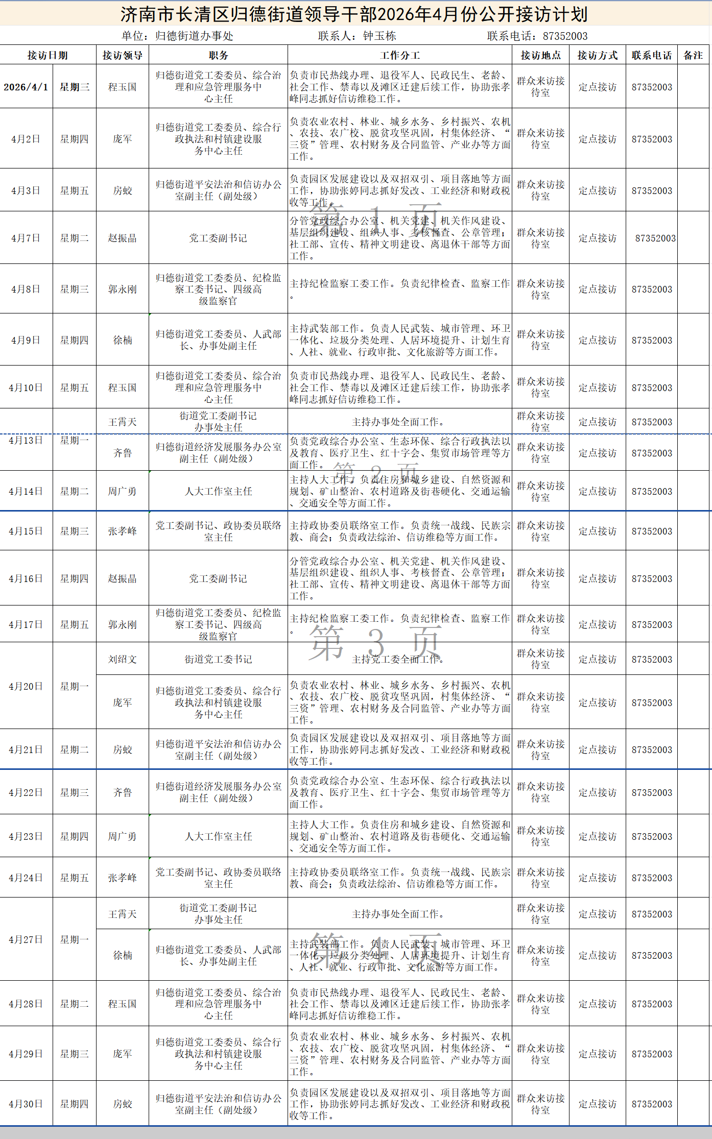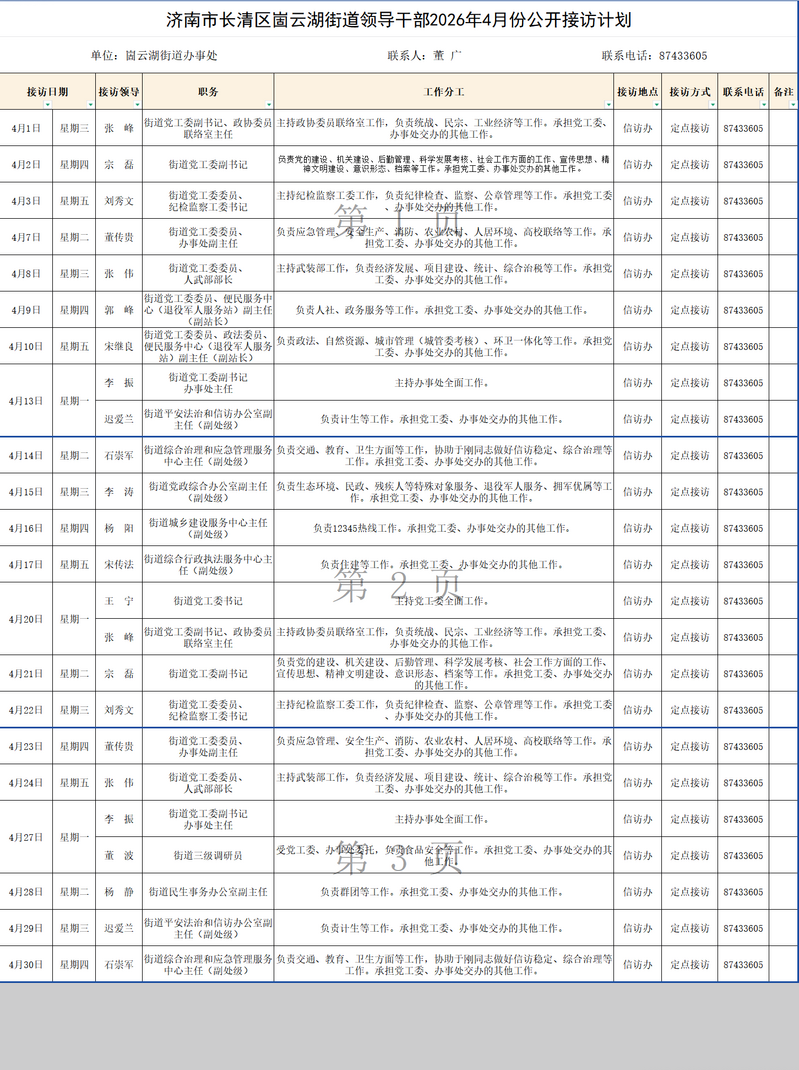 2026年4月街道(镇)领导干部接访日程安排表