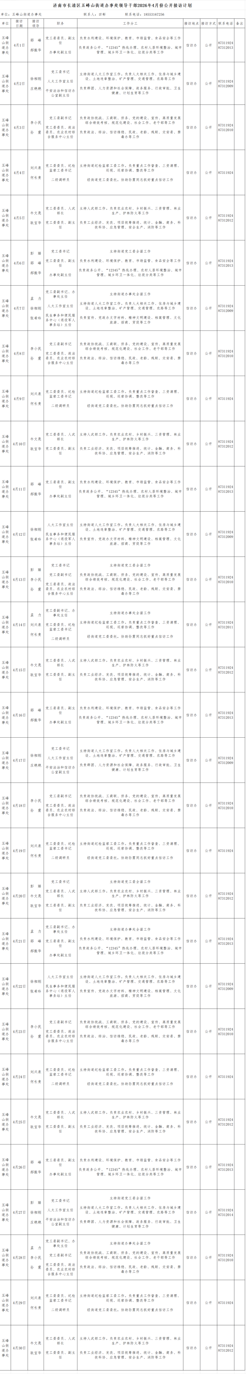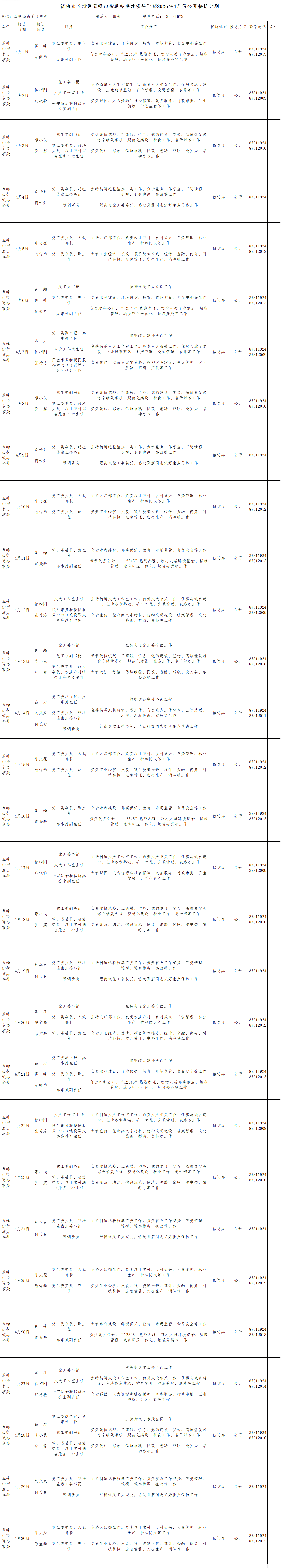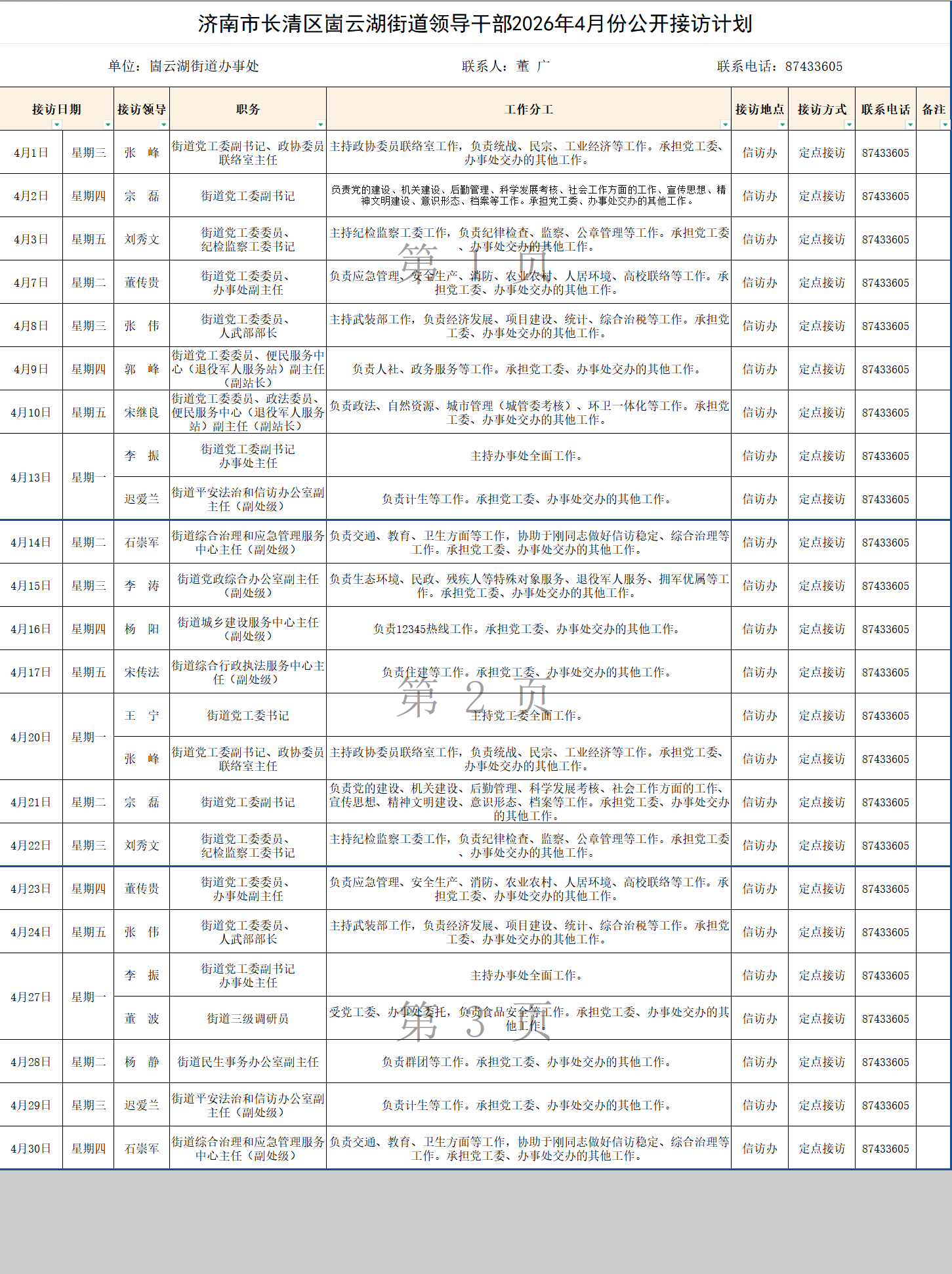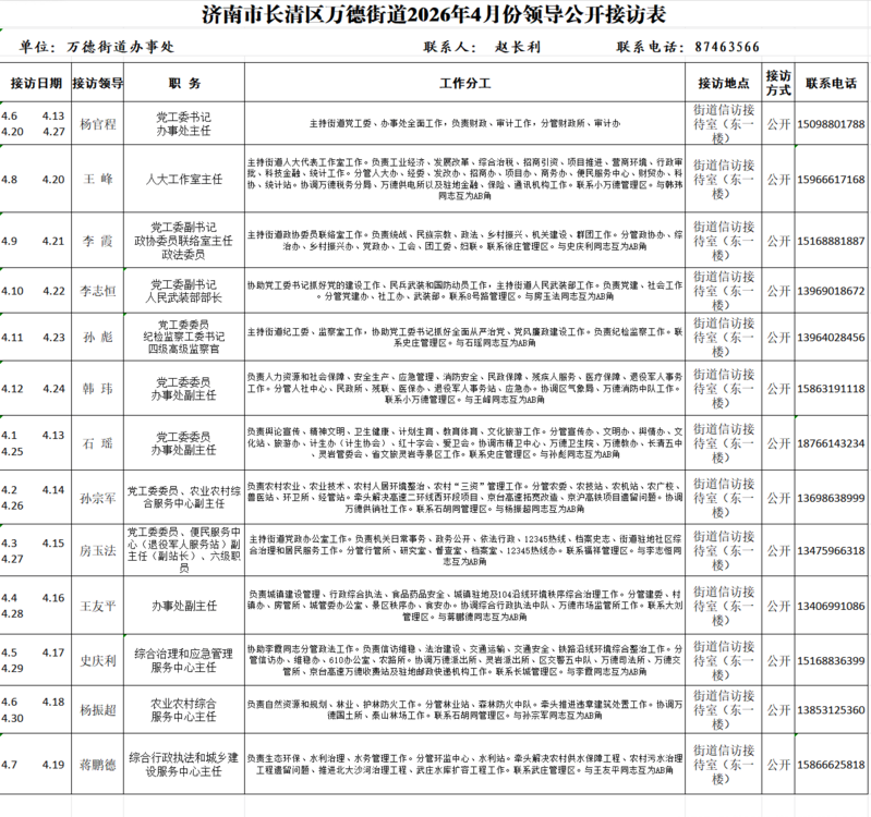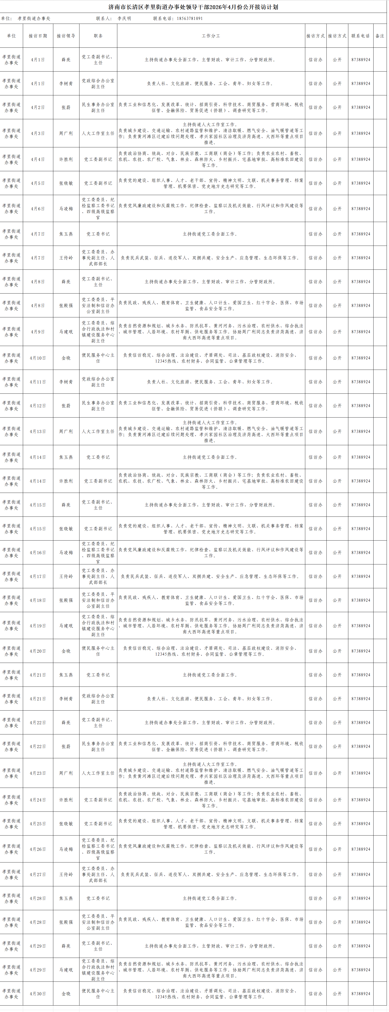 2026年4月街道(镇)领导干部接访日程安排表