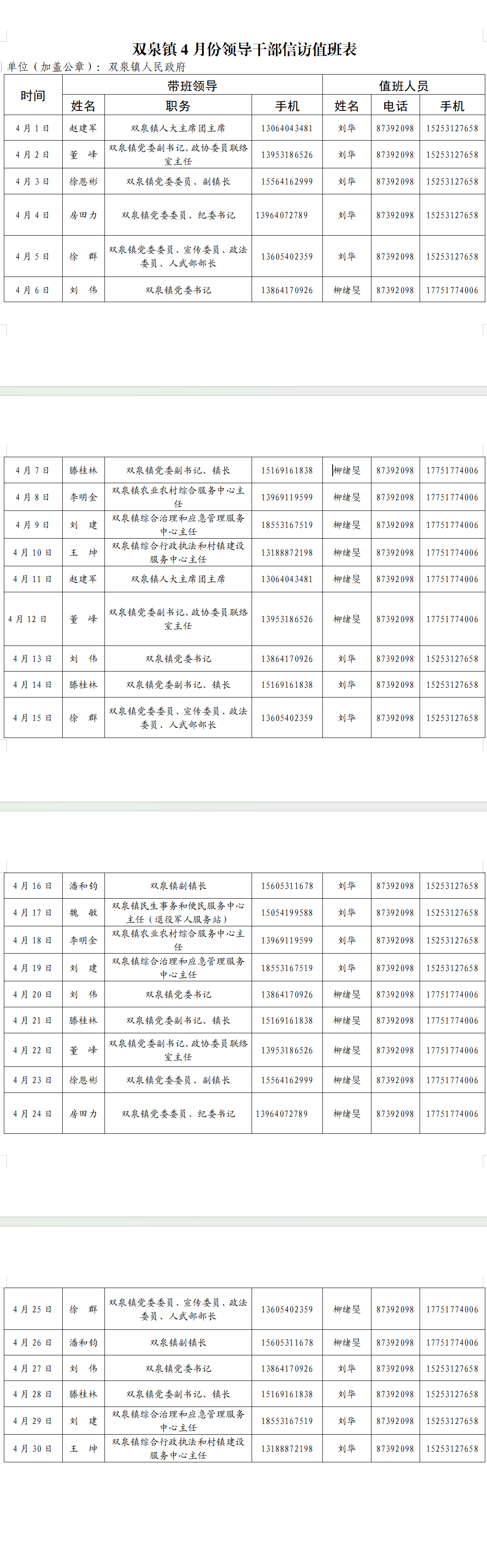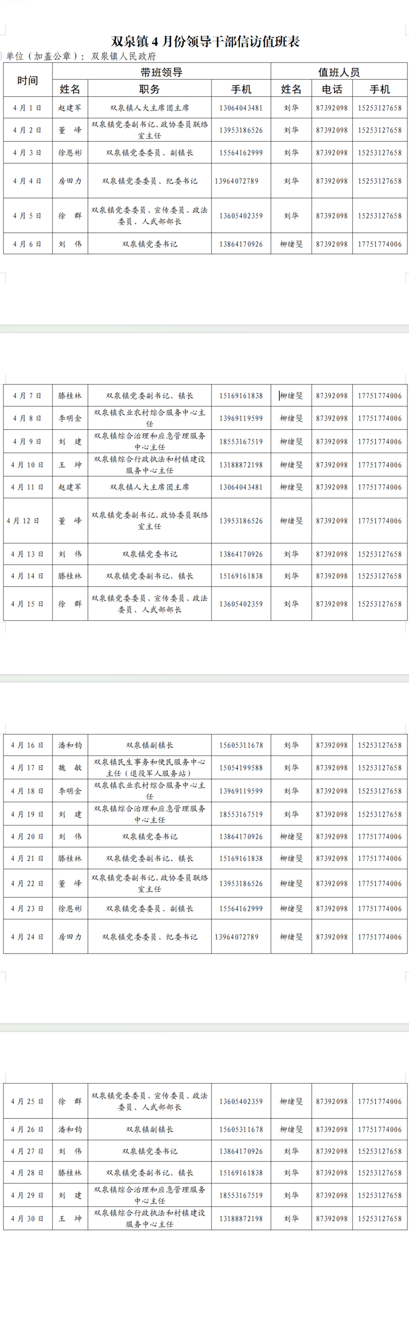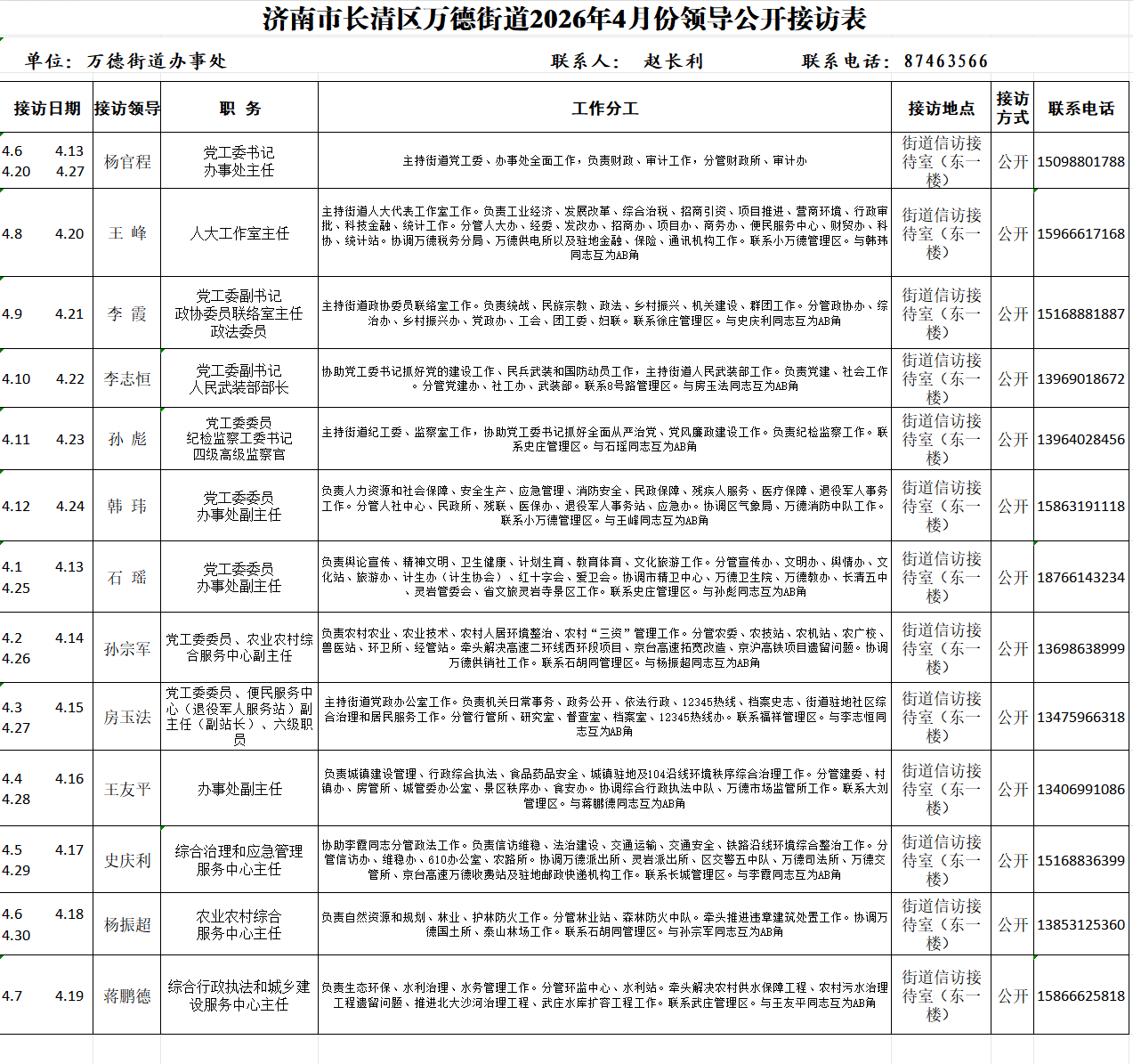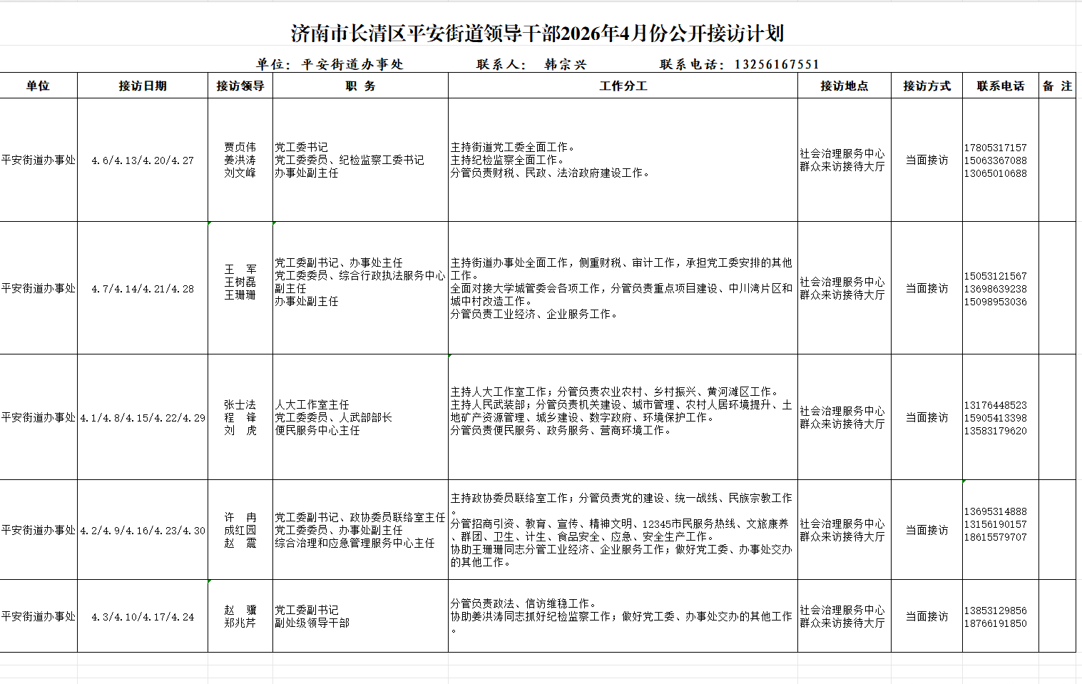 2026年4月街道(镇)领导干部接访日程安排表