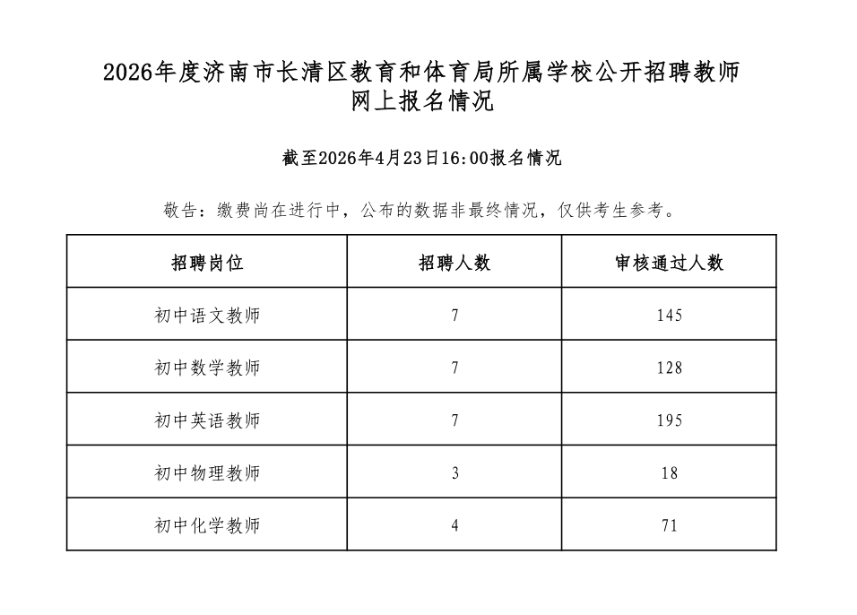 2026年度济南市长清区教育和体育局所属学校公开招聘教师网上报名情况(截至2026年4月23日16:00报名情况)