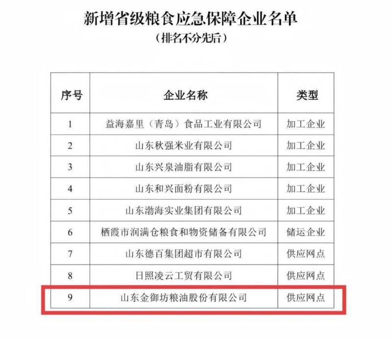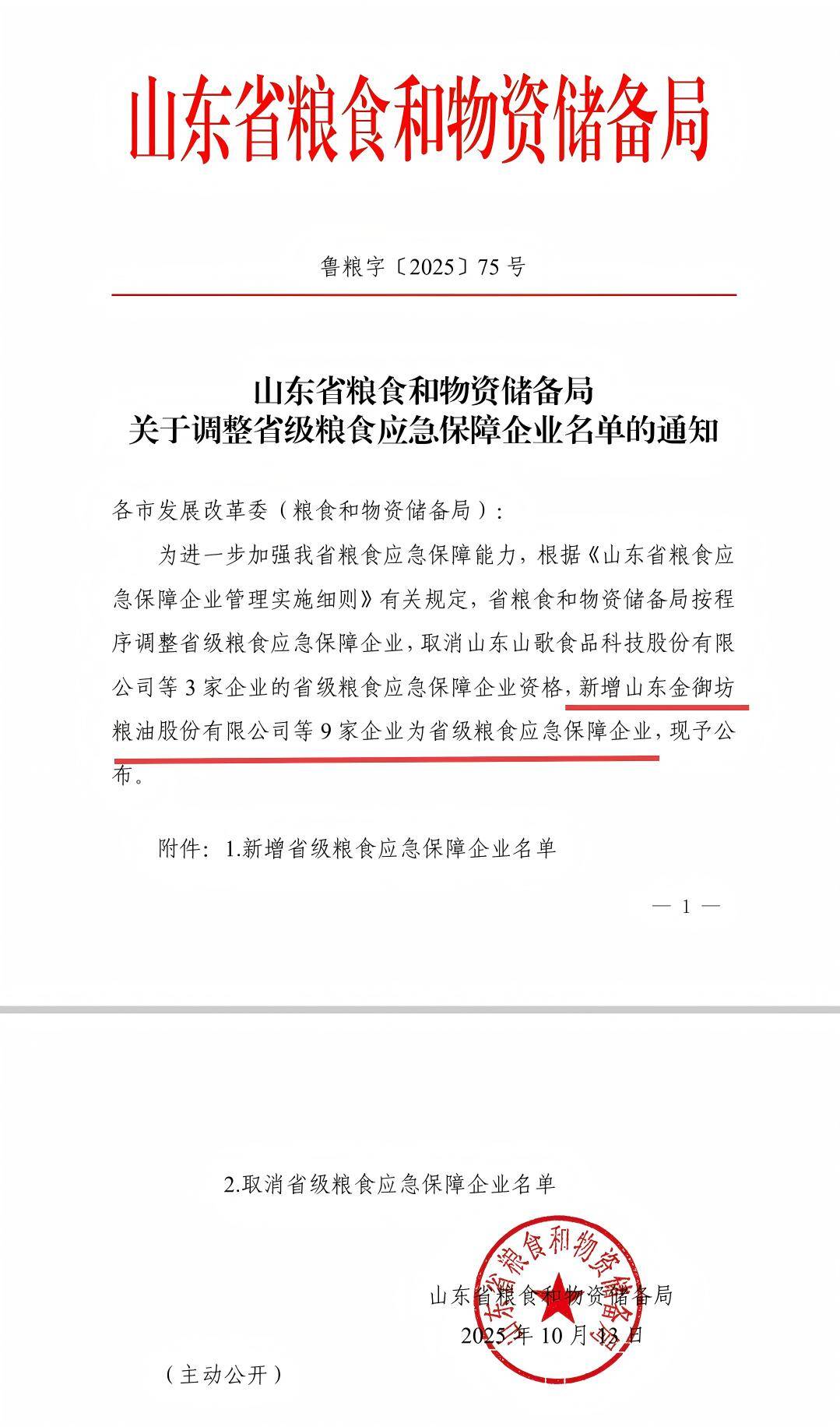 近日,根据《山东省粮食应急保障企业管理实施细则》相关规定,经企业申报、动员推荐、择优确定等严格程序环节,2025年10月,山东金御坊粮油股份有限公司成功入选山东省省级粮食应急保障企业名单。这一荣誉不仅是山东省粮食和物资储备局对山东金御坊粮油股份有限公司粮食应急加工、储备及保供能力的高度认可,更是企业践行粮食安全责任、主动融入全省应急保障体系的有力彰显。