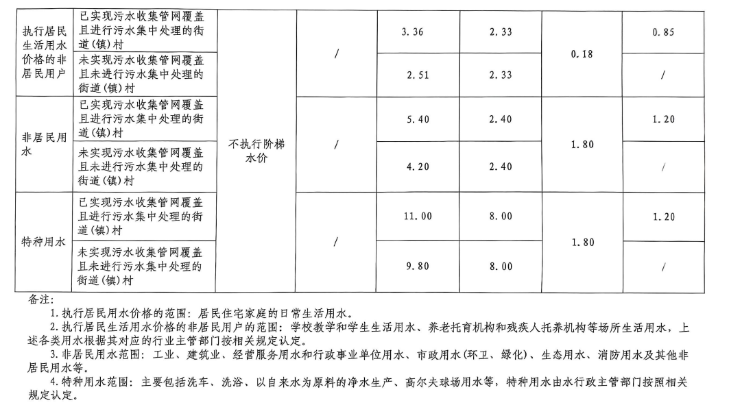 执行居民生活用水价格的非居民用户,不实行阶梯水价。到户水价为每立方米3.36元(基本水价2.33元、水资源税0.18元、污水处理费0.85元)。