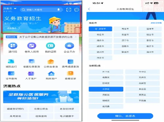 打开APP后,在首页右下角选择“我的”,点击“请登录”,进入登录/注册页面。已有账号的用户可以直接登录。未注册账号的用户,请点击“立即注册”进行账号注册。报名系统只可使用个人用户身份登录,请勿使用法人用户身份登录。登录完成后,在首页找到“义务教育招生”的轮播图片,或在下方【智“惠”生活】板块中,选择“学”,再选择“义务教育”招生进入。进入后,在上方选择【济南市】,下方选择【长清区】,并点击最下方的【确认,去报名】按钮。请根据自身需求选择一年级入学报名模块或小学阶段转学申请模块进行登陆,具体操作详见《2025年长清区义务教育阶段招生/转学系统使用手册》