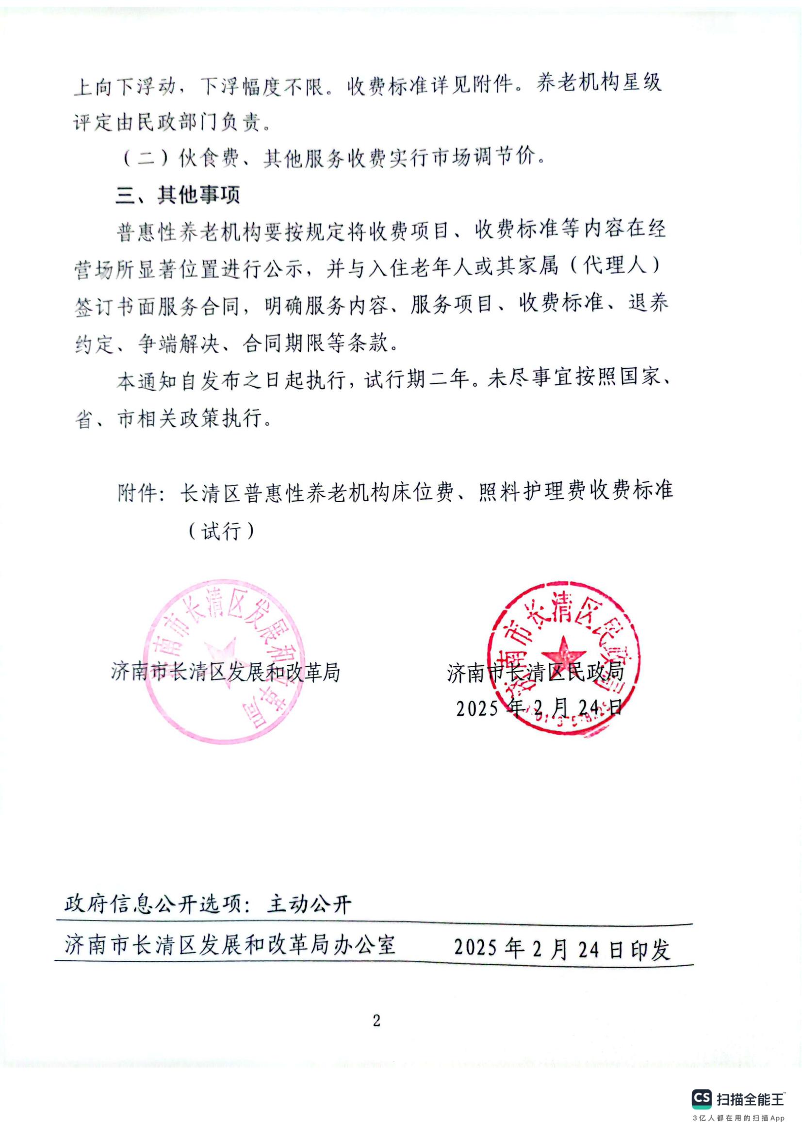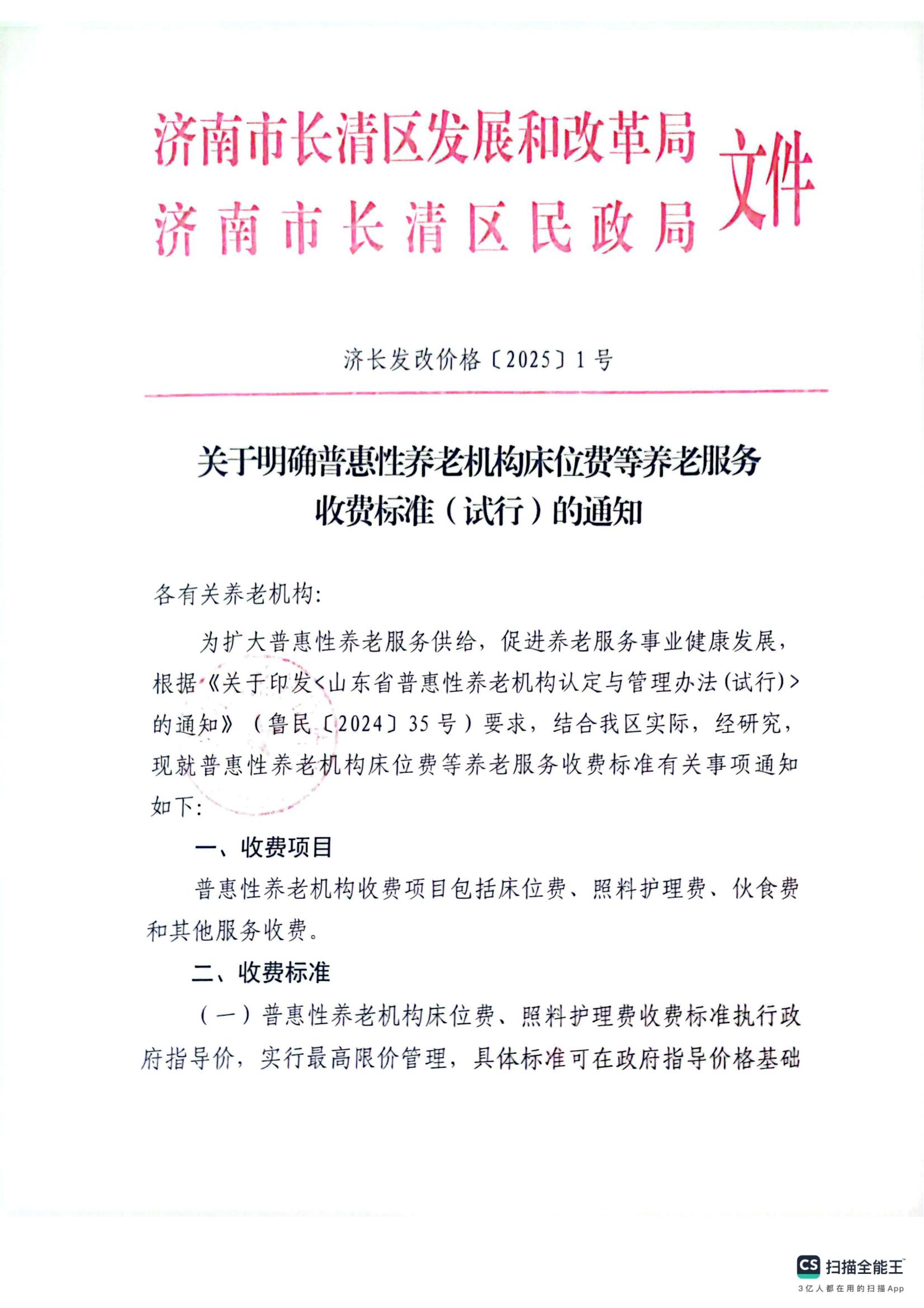 济南市长清区发展和改革局 济南市长清区民政局《关于明确普惠性养老机构床位费等养老服务收费标准(试行)的通知》济长发改价格2025.1号(1)(1).pdf